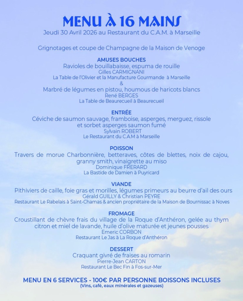 Le 30 avril 2026, la gastronomie se met au service de la solidarité avec 16 mains pour un copain. Un dîner caritatif organisé en soutien au chef Régis LEGAIN, et son épouse Marie prend place au restaurant du C.A.M, a l’Estaque. Propriétaires de l’hôtel restaurant Le Bosquet dans le pays angevin, ces derniers ont été durement touchés par les inondations de février 2026. L’intégralité des recettes de cette soirée, fixée à 100€ par personne avec boissons incluses, leur sera reversée. Cela permettra ainsi de contribuer concrètement à la reconstruction de leur établissement.