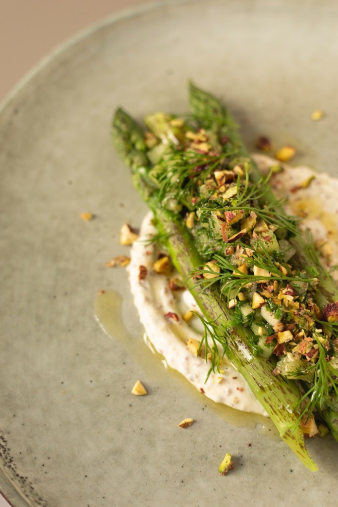 Placez une cuillère de yaourt fumé à la moutarde. Disposez les asperges sur le yaourt. Nappez délicatement les asperges avec le condiment kiwi aux herbes fraîches. Parsemez de pistaches concassées. Décorez avec quelques pousses d’aneth.