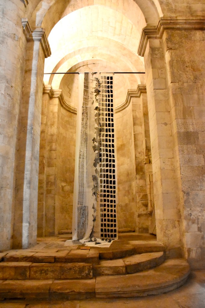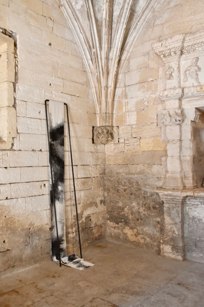 Les œuvres semblent flotter, telles une présence spirituelle faite de voiles et de textures effacées. En réalité, l’exposition invite les passants à mettre une intention, une conscience, entre le rapport de la création architecturale et les œuvres calligraphiques de Florence. Par conséquent, le lieu devient aussi une œuvre, sans distinction avec le travail de l’artiste. L’idée est donc de se confronter au silence de cette nef romane singulière pour mieux entendre ce que nous avons à nous dire.