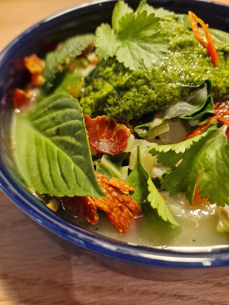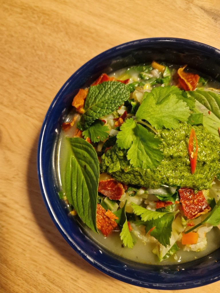 D’ailleurs, cette amoureuse du sud et du soleil prépare l’ouverture de son propre restaurant. En effet, une cantine surnommée Khantok va bientôt voir le jour. Elle y mêlera la cuisine thaïlandaise, laotienne et vietnamienne, rendant ainsi hommage à ses origines. Son objectif est de proposer une carte authentique et créative, alliant tradition asiatique et influences personnelles. Par ailleurs, elle nous dévoile aujourd’hui sa recette de soupe au pistou spéciale hiver, avec un pesto asiatique et des chips de jambon cru, en accord avec la saisonnalité.