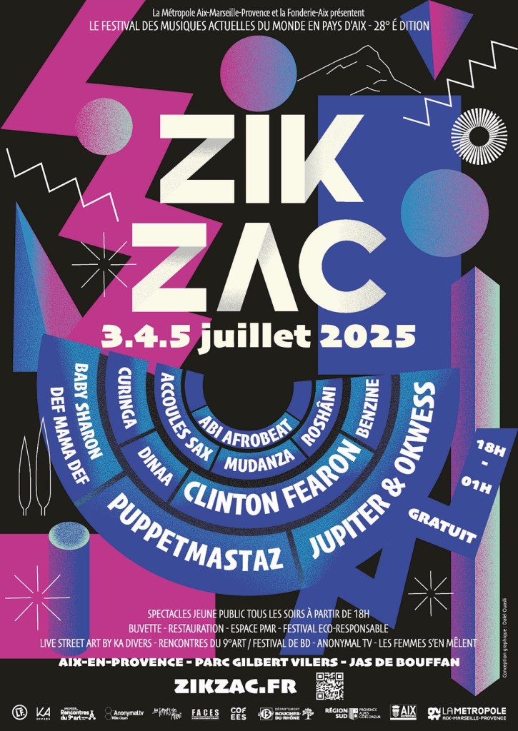 Installé au cœur du quartier populaire du Jas de Bouffan à Aix-en-Provence, le Zik Zac Festival revient pour sa 28e édition avec une ambiance festive, intergénérationnelle et résolument engagée. Ce festival gratuit et en plein air propose trois soirées de concerts, des spectacles jeune public, des expositions BD et street art, ainsi que des performances de live painting. Cette année, Zik Zac met en avant une programmation féminine forte. D’ailleurs, le collectif Les Femmes s’en Mêlent en sont l’acteur majeur de la visibilité des artistes femmes dans les musiques actuelles. Parmi les têtes d’affiche : les Berlinois déjantés Puppetmastaz, l’icône du reggae Clinton Fearon, le groupe congolais Jupiter & Okwess, mais aussi de nombreuses découvertes venues des quatre coins du monde. Une véritable immersion dans les sons d’ailleurs et les rythmes de demain.